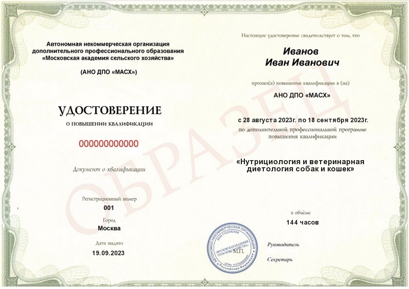 Нутрициология и ветеринарная диетология собак и кошек (144ч)