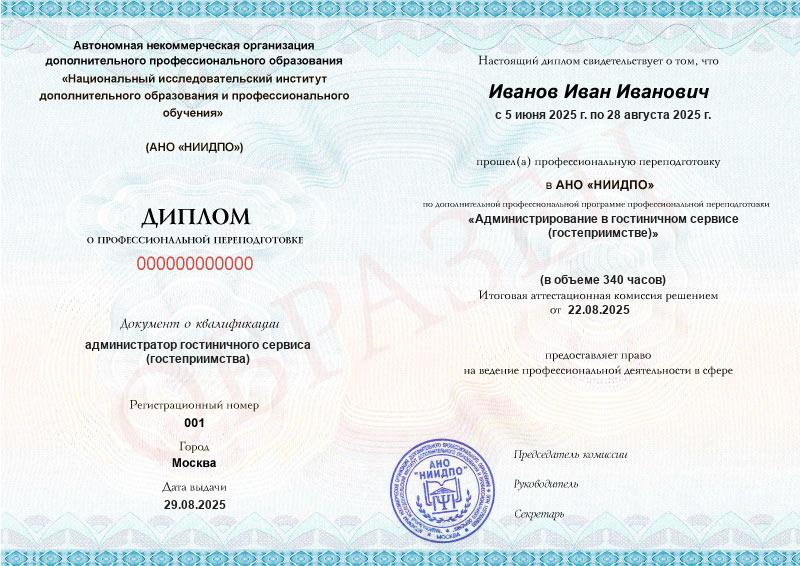 - Квалификация: администратор гостиничного сервиса (гостеприимства)