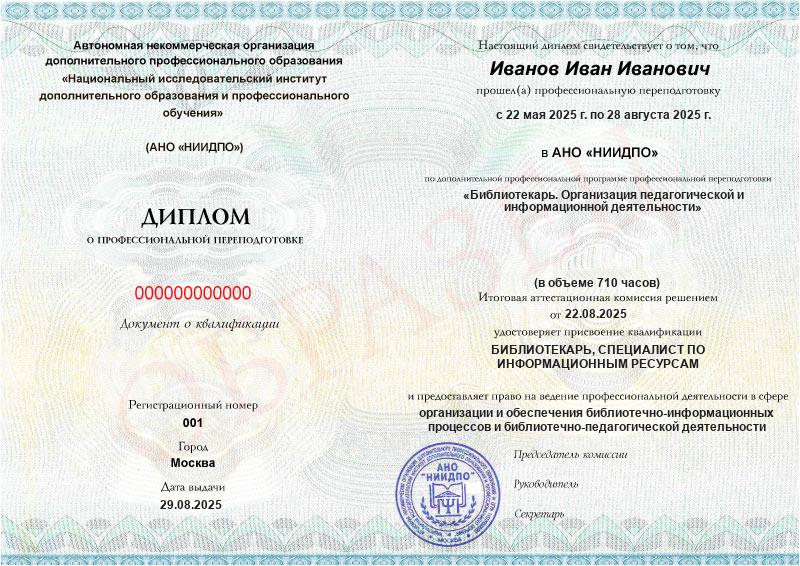 - Квалификация: Библиотекарь, специалист по информационным ресурсам