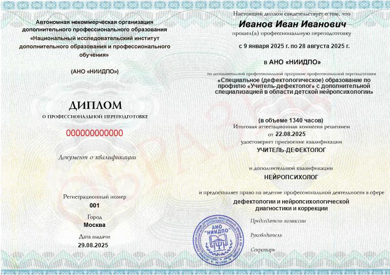 Специальное (дефектологическое) образование по профилю «Учитель-дефектолог» с дополнительной специализацией в области детской нейропсихологии (1340ч)