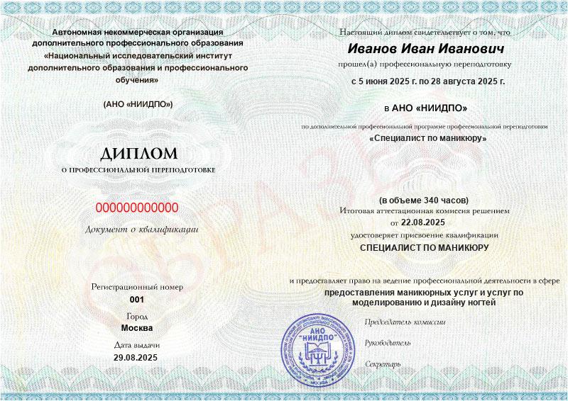 Да, документы оформляются на бланках с защитой от подделок, заполняются на русском языке, в них ставится печать АНО «НИИДПО».