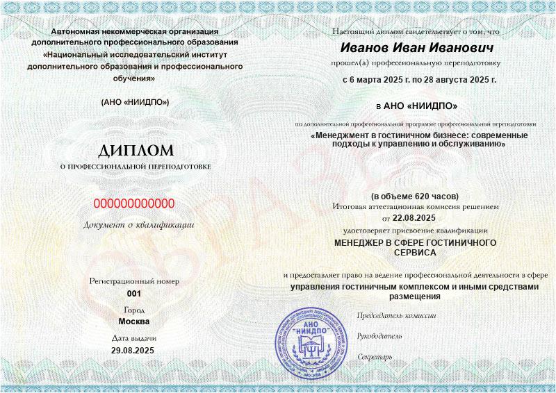 - Квалификация: Менеджер в сфере гостиничного сервиса