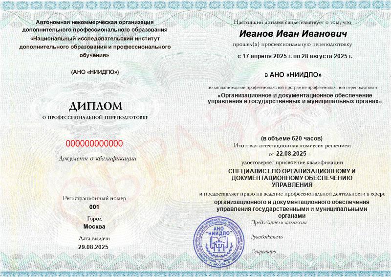 - Квалификация: Специалист по организационному и документационному обеспечению управления