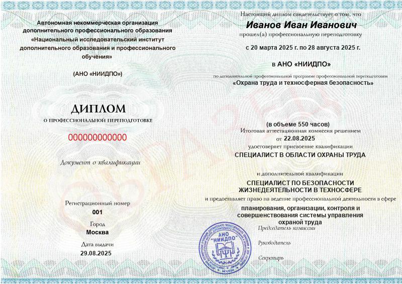 Диплом о профессиональной переподготовке с присвоением квалификации «Специалист в области охраны труда» с дополнительной квалификацией «Специалист по безопасности жизнедеятельности в техносфере» Диплом действует на территории всей России и признается государственными и частными организациями.