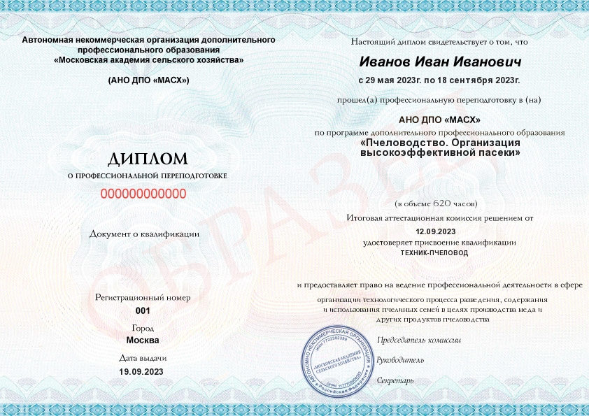 - Квалификация: Техник-пчеловод