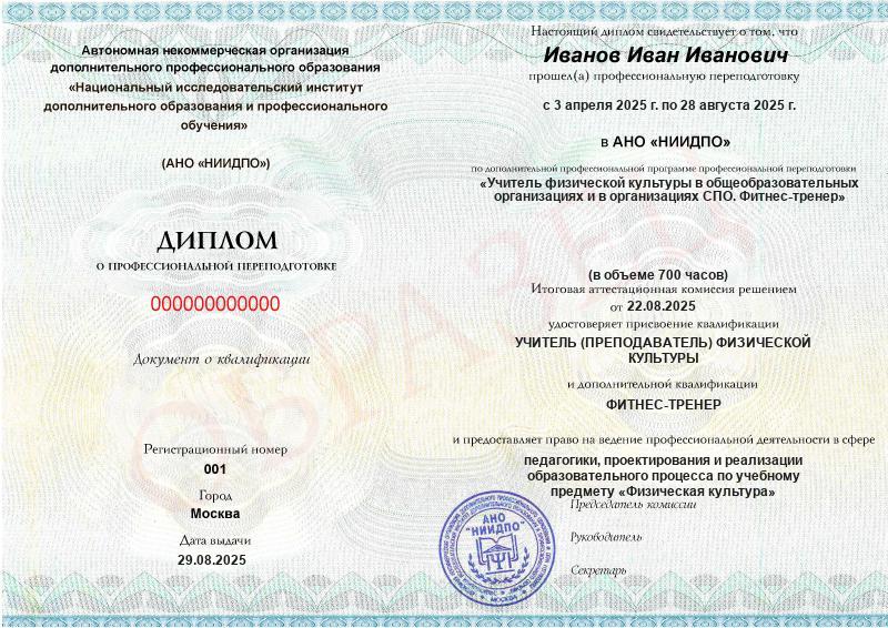 - 2 квалификации: Учитель (преподаватель) физической культуры + Фитнес-тренер